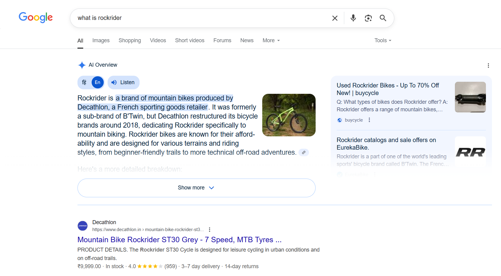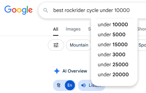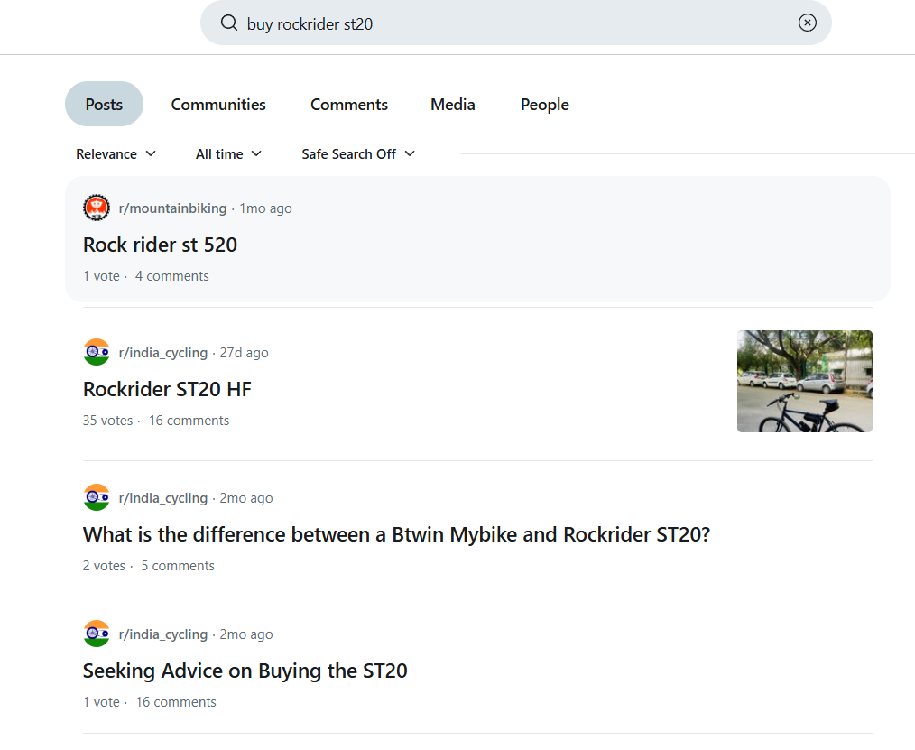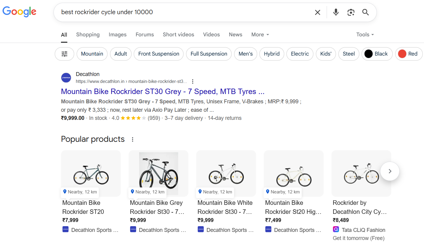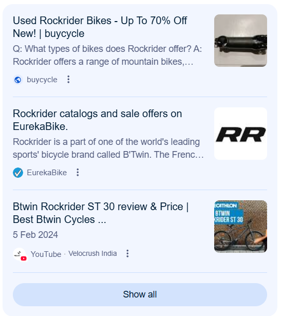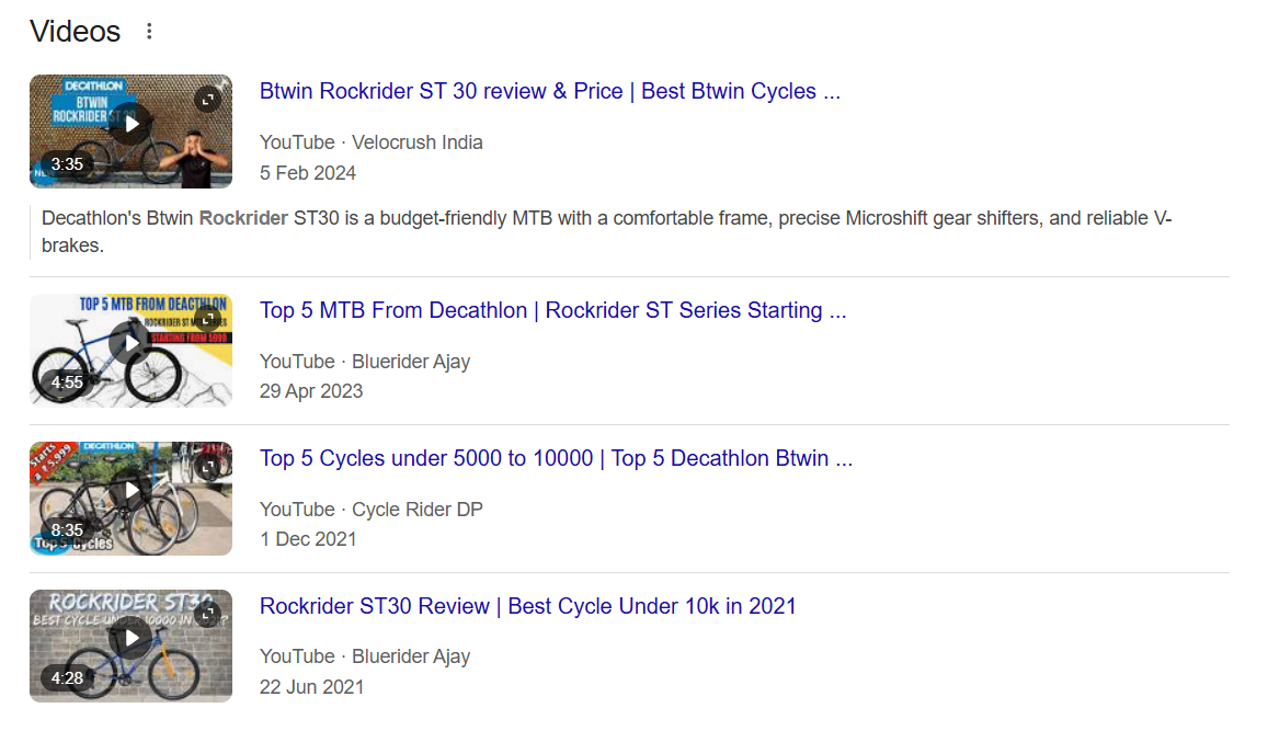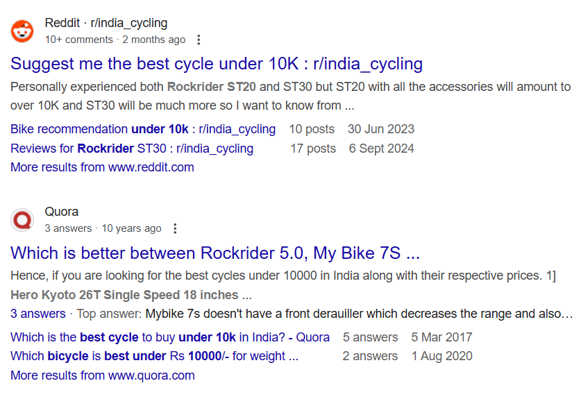 I’ll take my own example to make it more personal and practical. Around a couple of month back, I had a sudden urge to start cycling again as my 2 wheeler broke down and it wasn’t time for a new one just yet so the only possible option was to buy a cycle under my budget. Now I know what a cycle is so searching a basic query like “What is Cycle” doesn’t apply here but I one thing I always wanted to have is a geared cycle but again, that is something we can talk with each other to resolve the query but once when I was roaming in Decathlon, my eyes glimpsed over a kind of cycle which the brand produce and here is where the searchers journey mostly get started by. No one in my immediate circle had any idea about the cycle the brand produce but one thing I did got was the name which was “Rockrider” and here I had my search intent clearly laid out with the first category which is